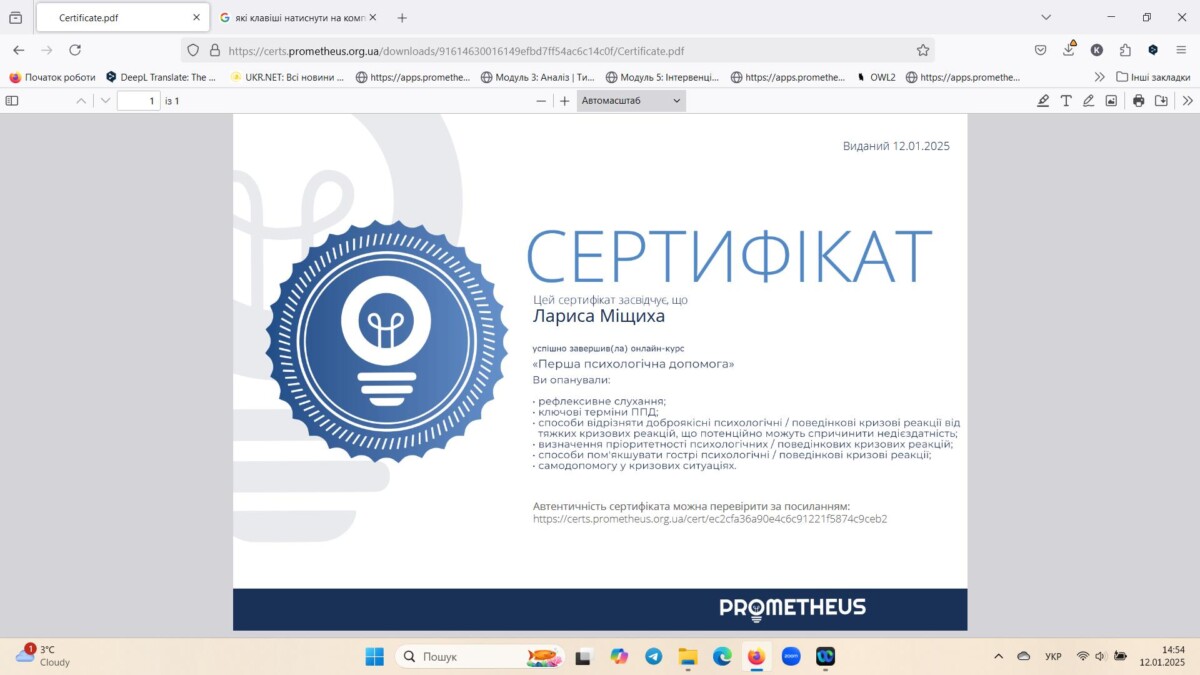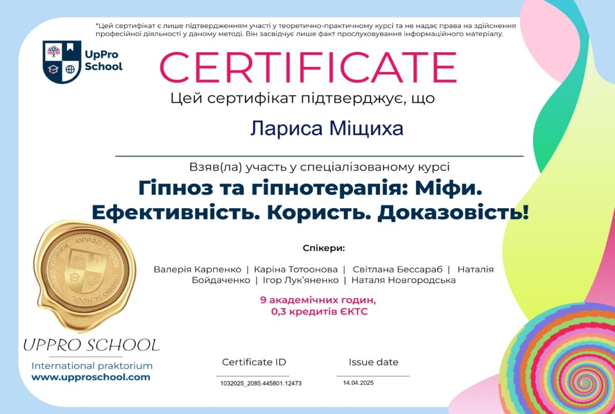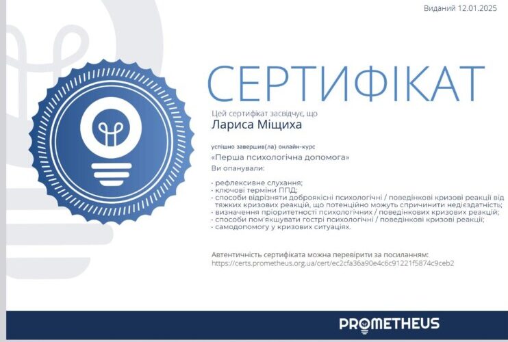 Комплексне підвищення кваліфікації доктора психологічних наук, доцента, професора кафедри загальної психології Міщихи Лариси Петрівни загальним обсягом 180 годин (6 кредитів ECTS) за програмою «Професійний розвиток, удосконалення загальних і професійних компетентностей викладачів вищої школи». Свідоцтво про підвищення кваліфікації № ADV-080734-CUSU від 18.08 2024р. (8.07.2024.р – 18.08.2024р), м. Київ.